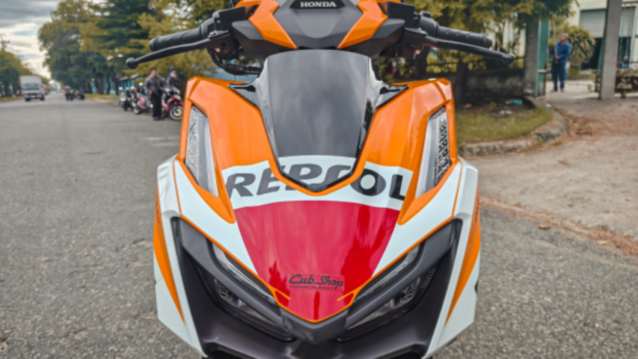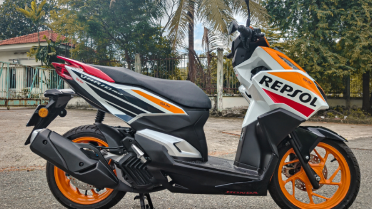 Tampilan skutik bongsor ini benar-benar mencuri perhatian. Mengusung semangat street bike ala MotoGP, Vario 160 Repsol Edition hadir dengan kombinasi warna oranye, merah, dan putih yang khas.