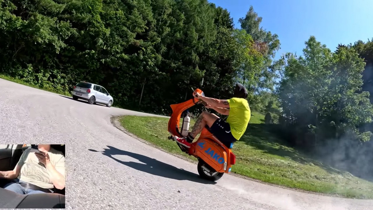Buat yang belum kenal, Schachermayr ini emang terkenal sebagai stunt rider yang hobi ngelakuin hal-hal nggak masuk akal di atas Vespa.