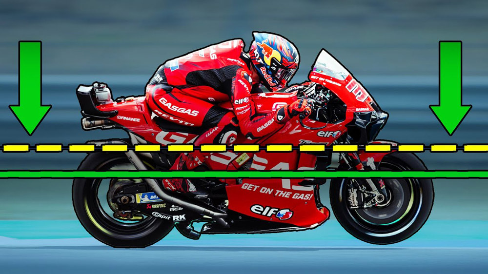 Hasilnya, center of gravity jadi lebih rendah, traksi meningkat, dan motor tidak mudah wheelie. Hal ini penting sekali saat start atau saat ingin menyalip di trek lurus.