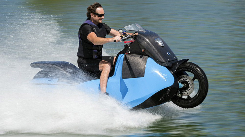 Biski terlihat seperti motor touring biasa, tapi dengan satu tombol, motor ini bisa berubah fungsi menjadi jet ski.