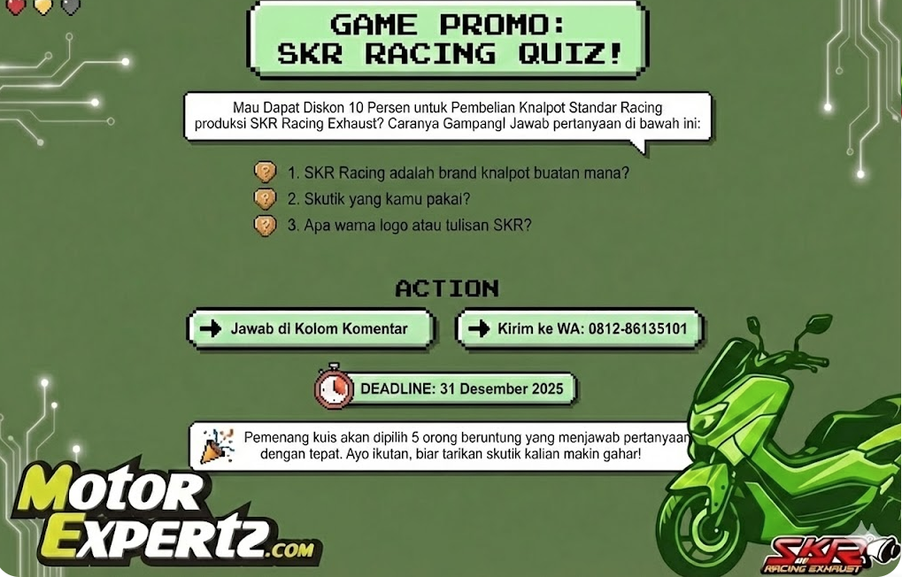 Nah, ada kabar gembira buat Bradzis yang mau upgrade performa tapi tetap hemat budget. Motorexpertz.com bekerja sama dengan SKR Racing Exhaust mengadakan kuis spesial akhir tahun!