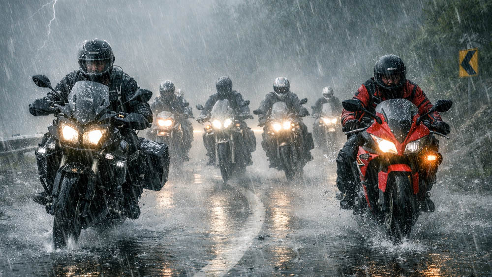 Hujan ekstrem adalah kondisi paling sering dihadapi rider Indonesia. Saat hujan deras, jarak pandang turun drastis, aspal jadi licin, dan risiko aquaplaning meningkat. Rem juga tidak bekerja seefektif kondisi kering.