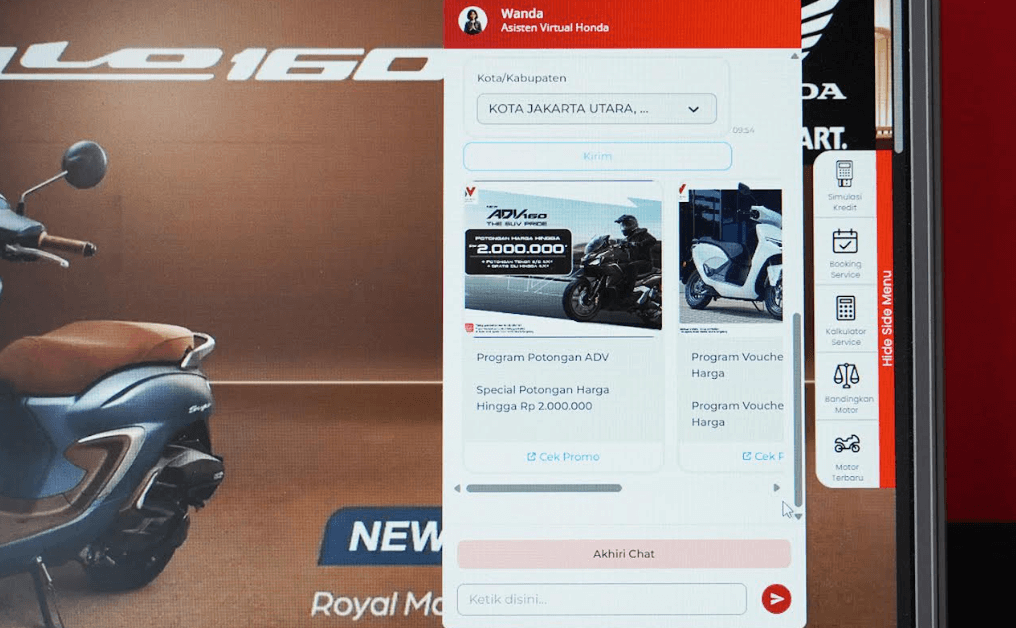 Sebagai Main Dealer sepeda motor Honda wilayah Jakarta–Tangerang, PT Wahana Makmur Sejati terus memperkuat layanan digitalnya. Lewat Wanda, konsumen bisa mengecek berbagai informasi penting seputar motor Honda sebelum memutuskan datang ke showroom.