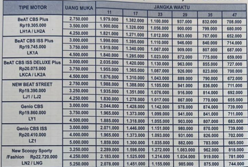 Ada beberapa jenis kredit motor baru yang dapat Anda pilih, seperti kredit dengan uang muka ringan atau tanpa uang muka, serta dengan tenor yang berbeda-beda.