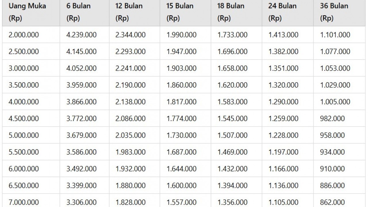 Cicilan terendahnya cuma Rp 862 ribu per bulan untuk tenor 36 bulan dengan DP Rp 7 juta.