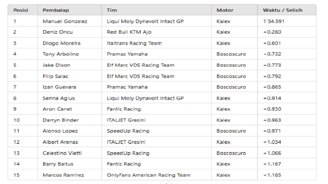 Dibawah ini adalah urutan pebalap di FP1 Moto2 Thailand 2025