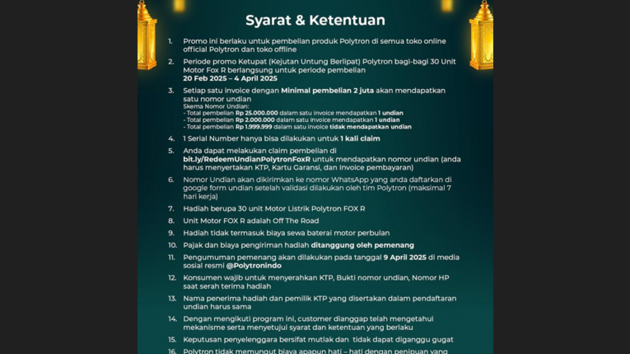 Ramadhan Berkah! Polytron Gelar Program Undian Berhadiah Motor Listrik, Ini Syarat & Ketentuannya