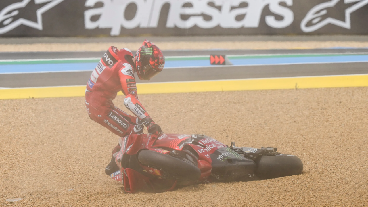 Pembalap Ducati Lenovo, Fransesco Bagnaia alami crash di tikungan 3 pada lap kedua sprint race Le Mans--MotoGP