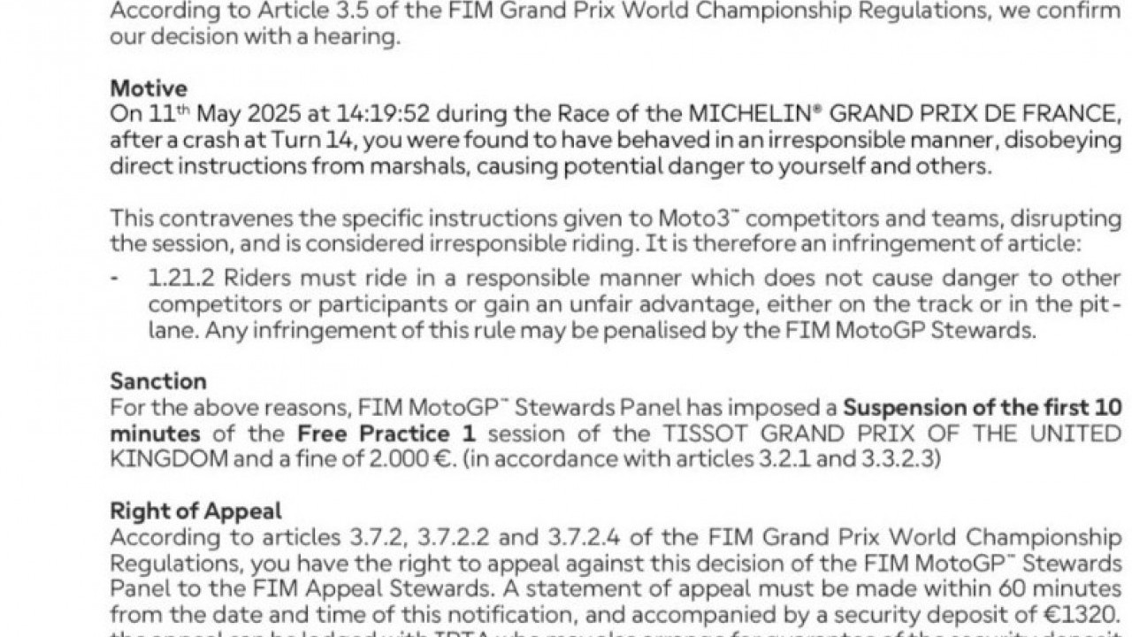 Quartararo malah kena apes dan makin nyesek lagi karena harus bayar denda 2.000 Euro alias sekitar Rp35 jutaan jelang seri MotoGP Inggris di Silverstone.