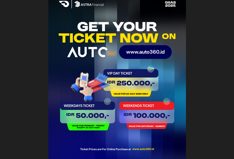 Tiket VIP Day dapat dibeli secara online melalui situs Auto360 seharga Rp250.000. Bagi yang ingin membeli langsung di lokasi pameran pada 24 Juli, tiket tersedia dengan harga Rp300.000.