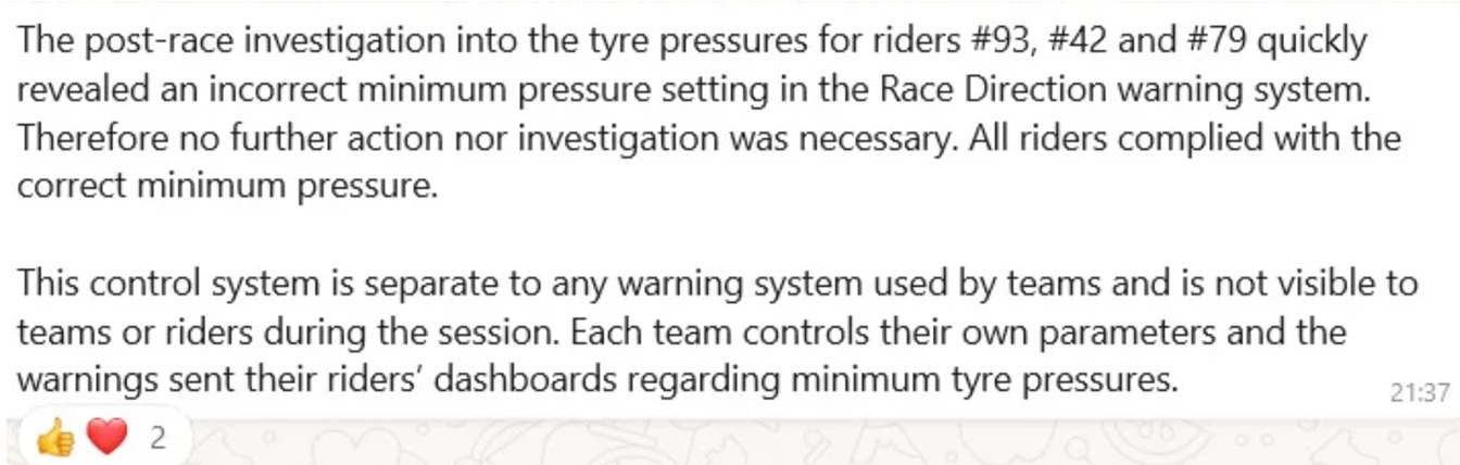 "Investigasi pasca-balapan terhadap tekanan ban untuk pembalap #93, #42, dan #79 dengan cepat mengungkapkan pengaturan tekanan minimum yang salah pada sistem peringatan Race Direction. Oleh karena itu, tidak diperlukan tindakan atau investigasi lebih lanjut. Semua pembalap mematuhi tekanan minimum yang benar."