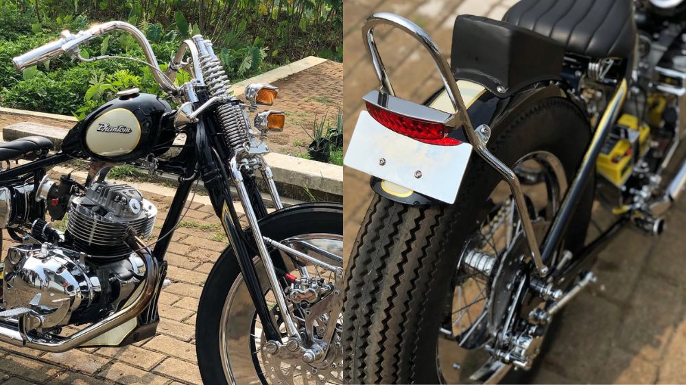 Bagian depan motor semakin gagah dengan pemasangan springer replika Harley-Davidson WL yang memberikan kesan klasik ala motor-motor Harley-Davidson lawas.