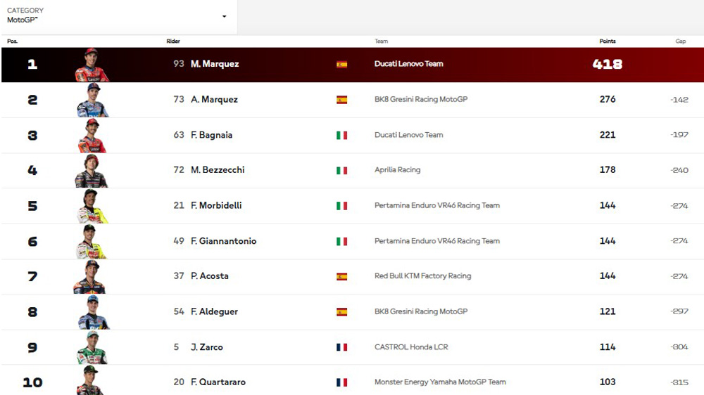 Berikut adalah Klasemen Sementara MotoGP 2025 jelang GP Hungaria: