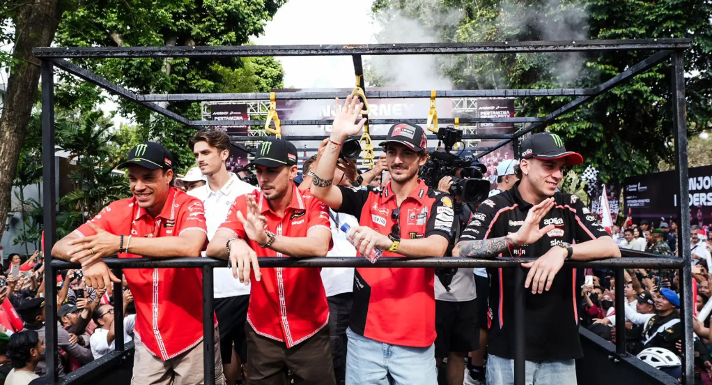 Tapi sorotan utama kali ini tertuju pada Mario Aji. Pembalap muda Indonesia itu mendapat sambutan paling meriah, menjadi bukti betapa bangganya publik melihat putra bangsa berdiri sejajar dengan rider dunia.