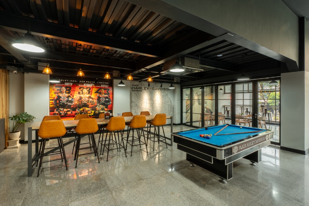 Di sini tersedia bar, meja biliar, foosball, dart, hingga smoking area. Area ini juga menjadi markas resmi H.O.G. Plaza Surabaya Chapter, menjadikan dealer ini benar-benar seperti “rumah kedua” bagi para bikers.