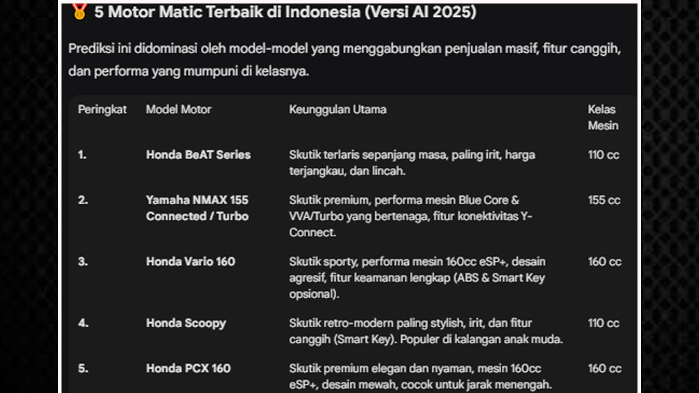 MOTOREXPERTZ.COM -- Berikut adalah pilihan lima motor matic terbaik di Indonesia versi Gemini Ai yang mungkin bisa kalian pilih.
