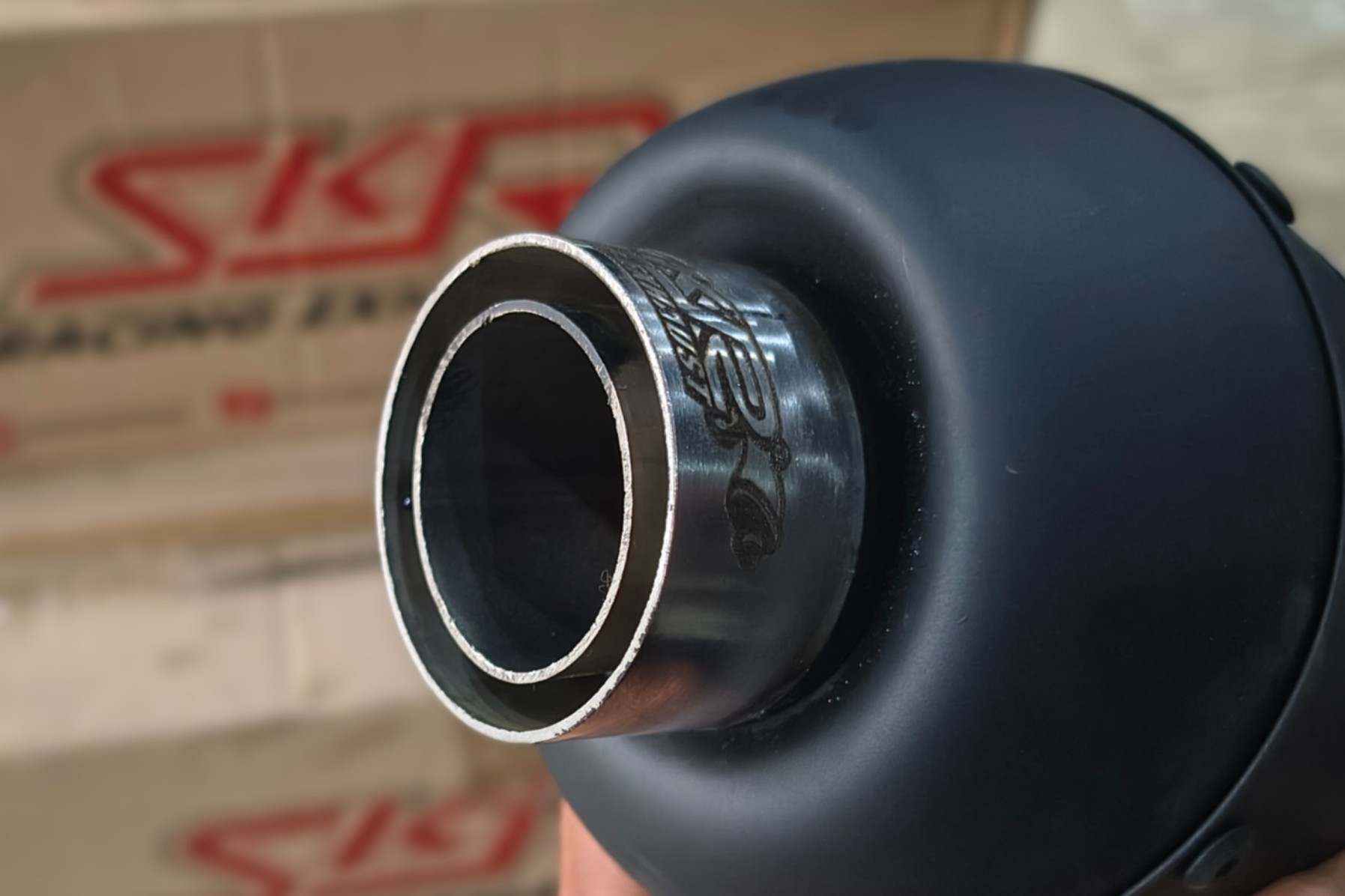 Dia ngasih rincian knalpot SKR Racing tipe tersebut dirancang dengan spesifikasi leher 28/32 mm.