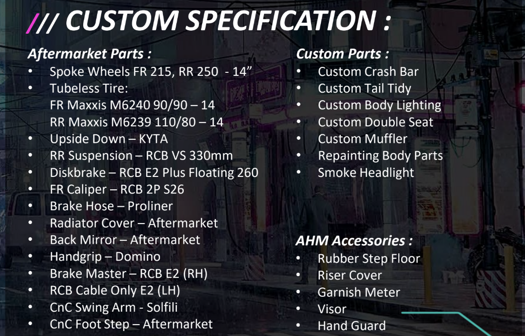 Selain itu, bodynya juga dihias body lighting, jok custom, crash bar, lampu depan smoked, serta aksesori resmi AHM seperti rubber step floor, riser cover, visor, dan hand guard.