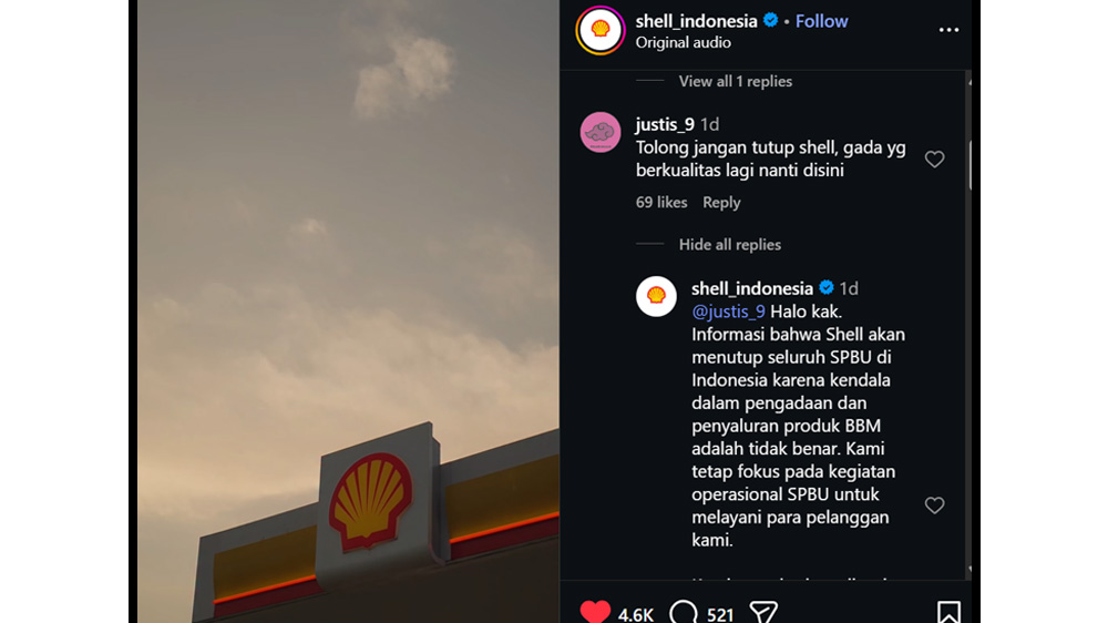 Lewat jawaban kepada netizen di kolom komentar di sosial medianya di Instagram, Shell Indonesia jika tentang kabar tutupnya Shell di Indonesia tidak benar.