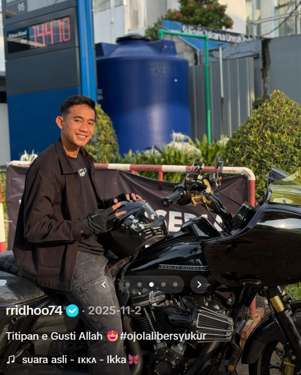 Dilihat dari postigannya di akun sosial media Tiktok miliknya, @rridhoo74, mantan pemain Persebaya Surabaya ini memperlihatkan motor cruiser andalannya tersebut dengan menuliskan caption "Titipan e Gusti Allah" dalam postingannya.